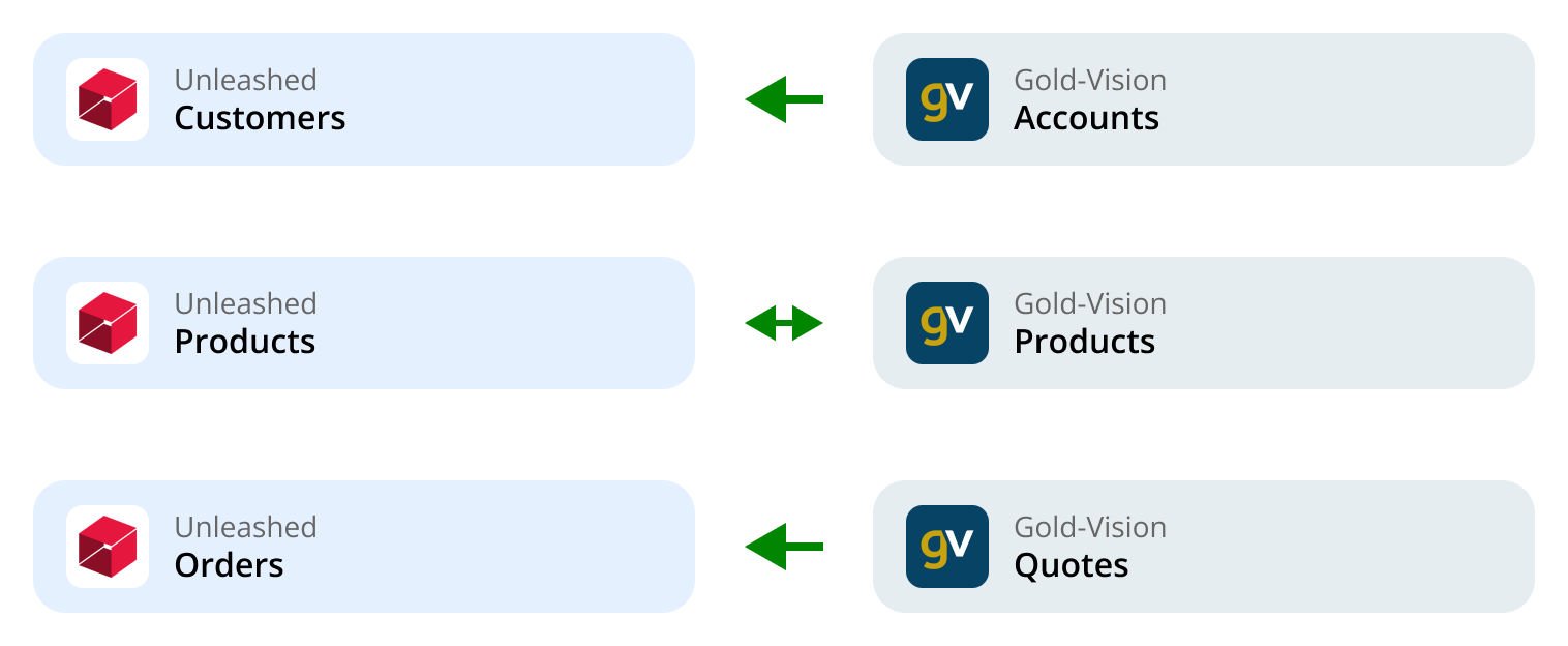 Automate the syncing of products, customer accounts, and sales orders between Gold-Vision and Unleashed. Eliminate duplicate data entry and cut down on costly mistakes.